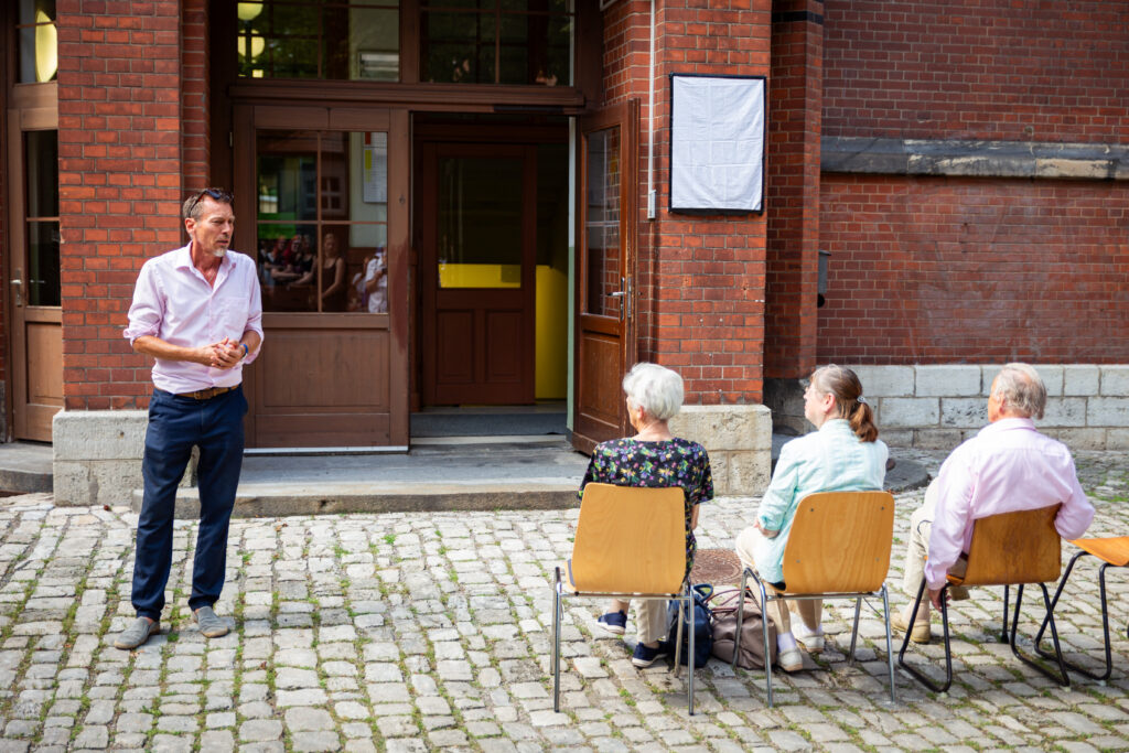 Der Leiter der Gedenk- und Bildungsstätte Andreasstraße Jochen Voit bei seiner Rede mit Angehörigen der Widerständler und dem Zeitzeugen Gerhard Laue
