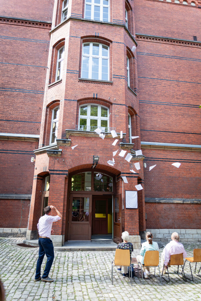 Um an die Flugblattaktion der Widerstandsgruppe zu erinnern, wurden Blätter aus dem ersten Stockwerk der Schule geworfen.