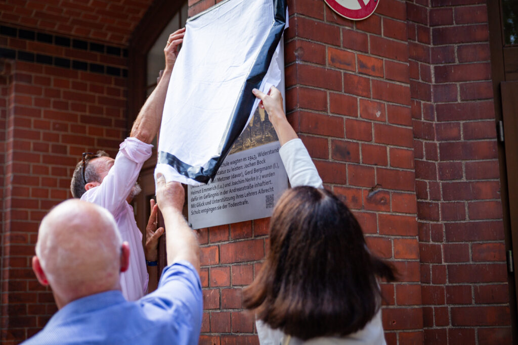 Nach einem symbolischen Flugblattwurf aus dem obersten Stock des Schulgebäudes und zur Live-Musik der Erfurter Sängerin Rona Stoica wurde die Gedenktafel schließlich feierlich enthüllt. Die Herstellung der Gedenktafel wurde gefördert durch die Thüringer Staatskanzlei und unterstützt durch die Stiftung Ettersberg / Gedenk- und Bildungsstätte Andreasstraße sowie die Vereinigung der Verfolgten des Naziregimes (VVN-BDA) und die Stadt Erfurt.