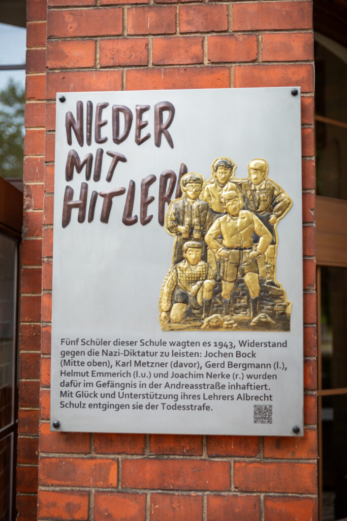 Die Gedenktafel der Widerstandsgruppe um Jochen Bock an der Fassade der Ludwig-Erhard-Schule in Erfurt (Motiv aus der Graphic Novel: Hamed Eshrat, Metallgestaltung: Reik Weller)