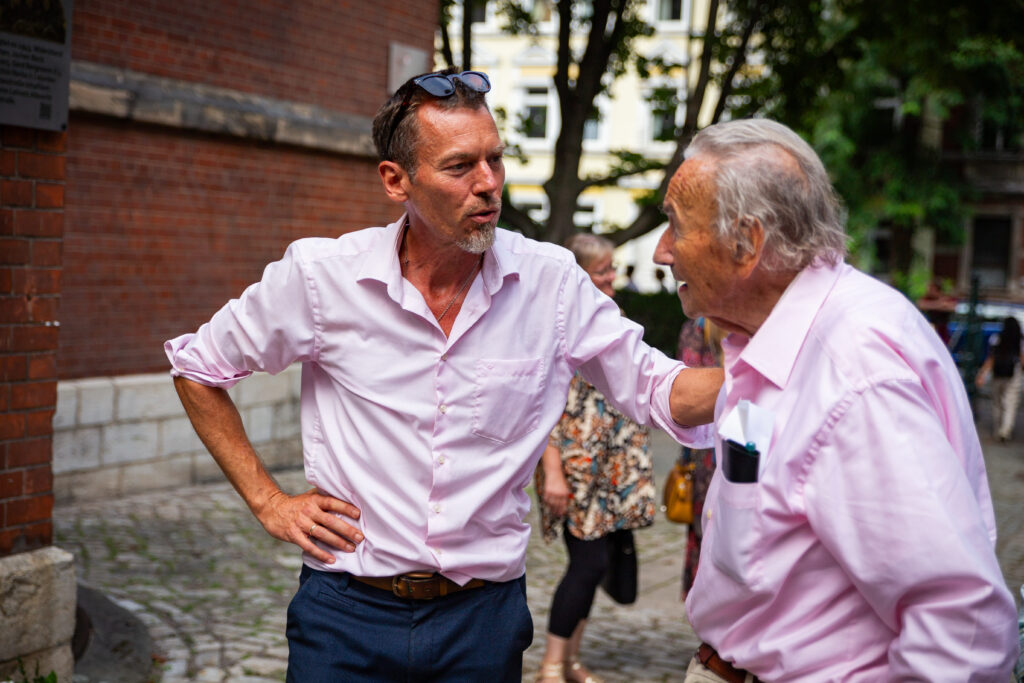 Jochen Voit und der Initiator der Gedenktafel Gerhard Laue im Gespräch vor der Schule