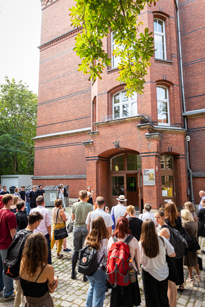 Teilnehmende der Gedenkveranstaltung vor der frisch enthüllten Tafel mit dem Comic-Motiv des Zeichners Hamed Eshrat